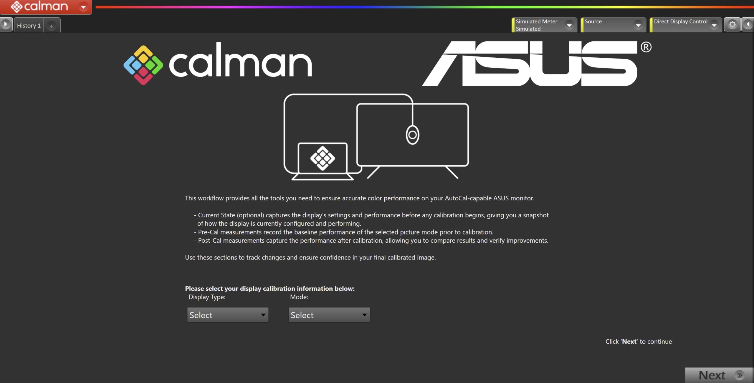 - On the introduction screen, select your display type (OLED or LCD) and mode (SDR or HDR) from the dropdown and click Next to proceed to Hardware Setup