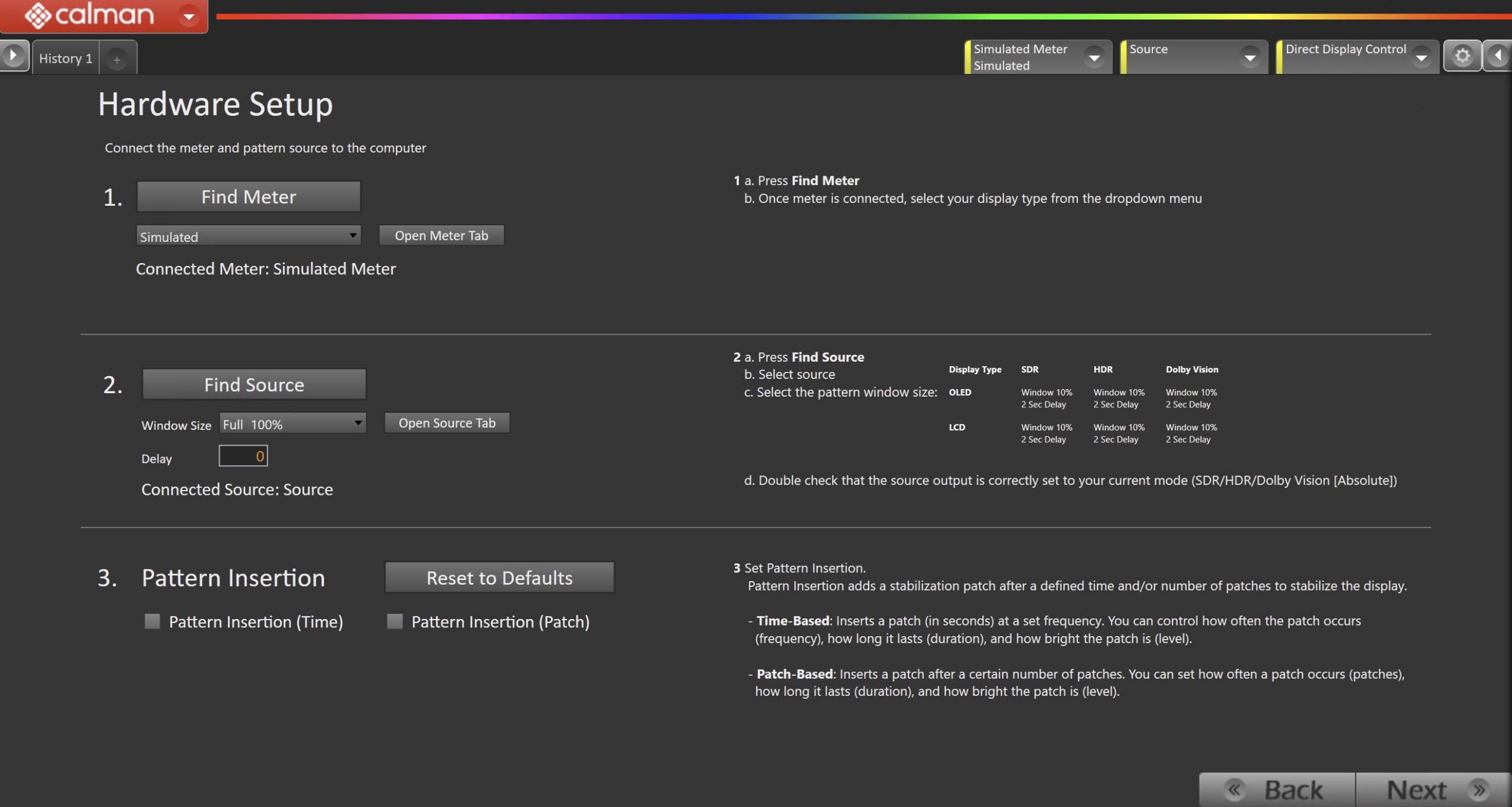 - Click the Reset to Defaults button to set the appropriate pattern insertion for the display and calibration type in Step 1