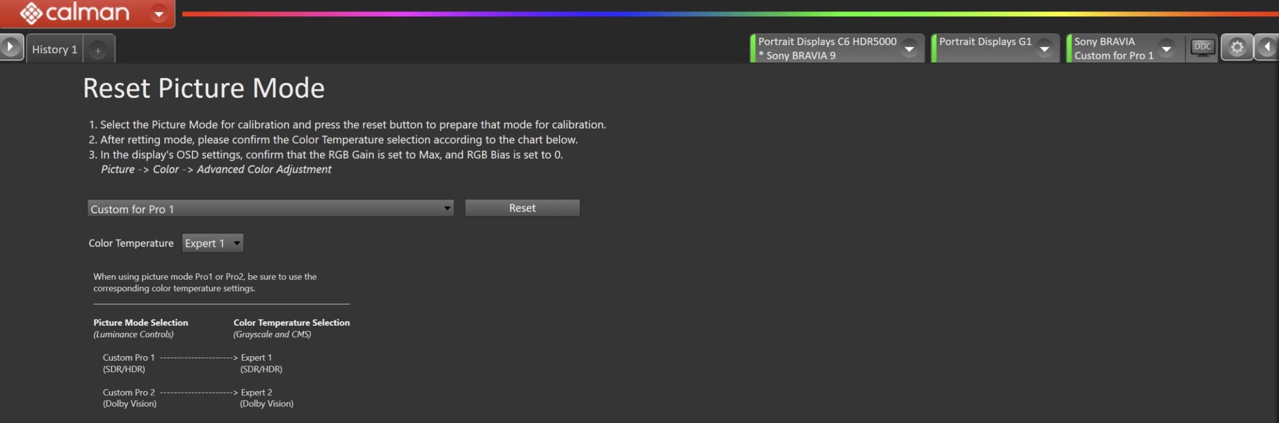 - Confirm your picture mode and color temperature settings, and click the Reset button. This resets and prepares the picture mode for calibration.