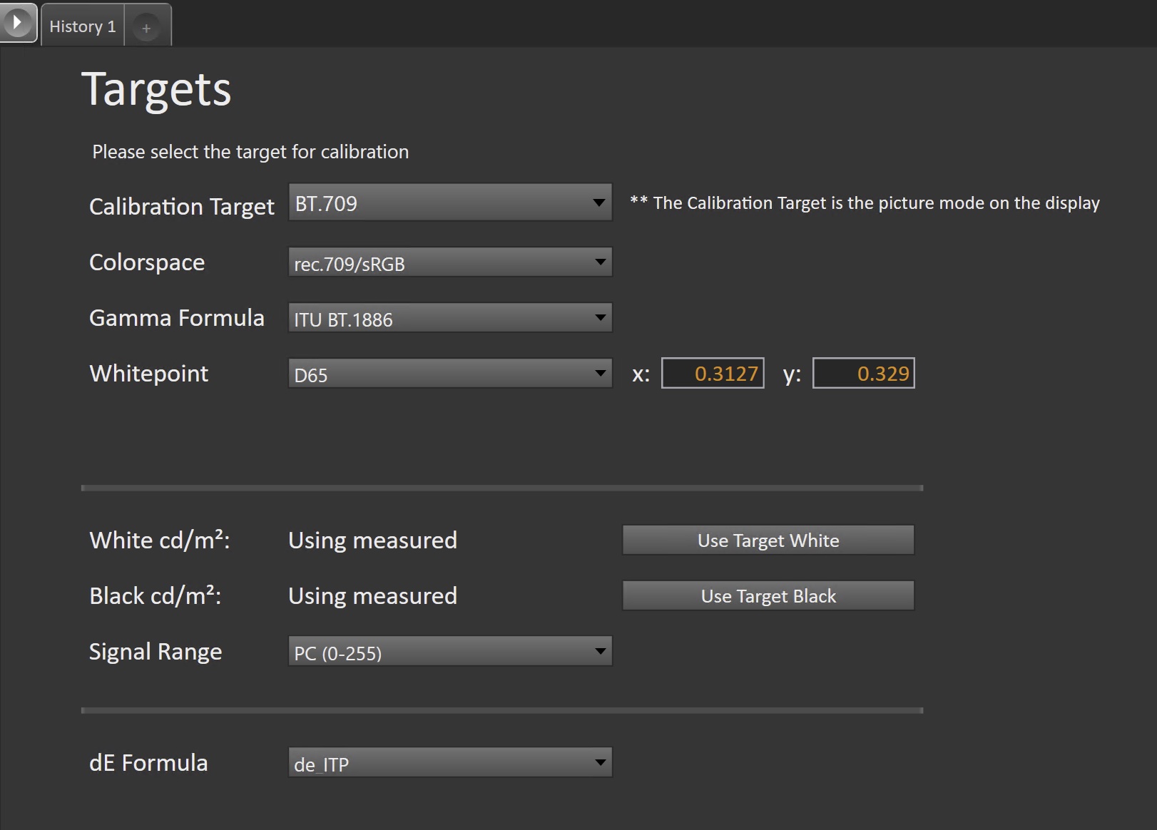 - Select your desired calibration targets, these will vary based on your SDR or HDR choice in Step 1