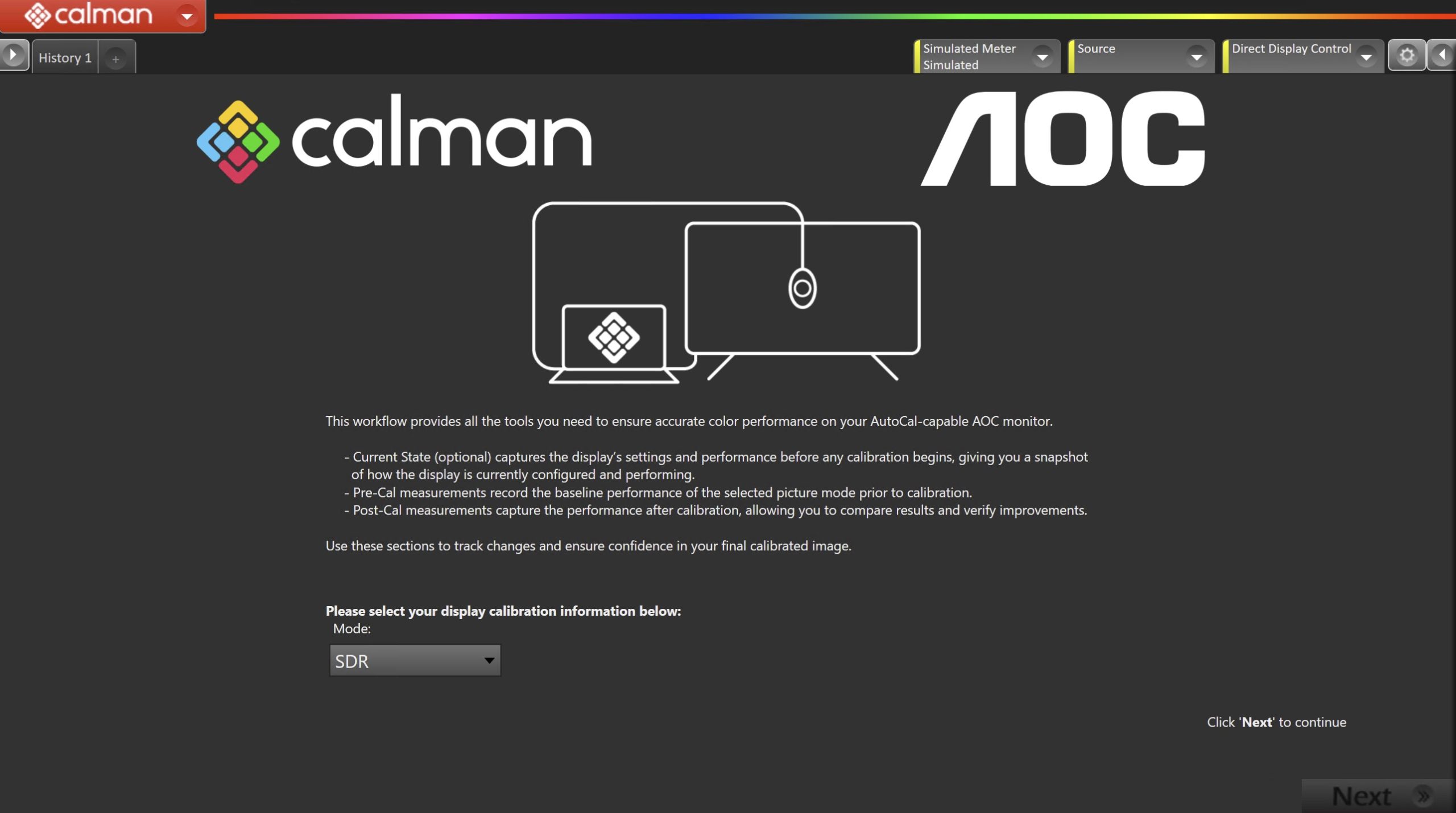 - On the introduction screen, select your calibration mode (SDR/HDR) from the dropdown and click Next to proceed to Hardware Setup