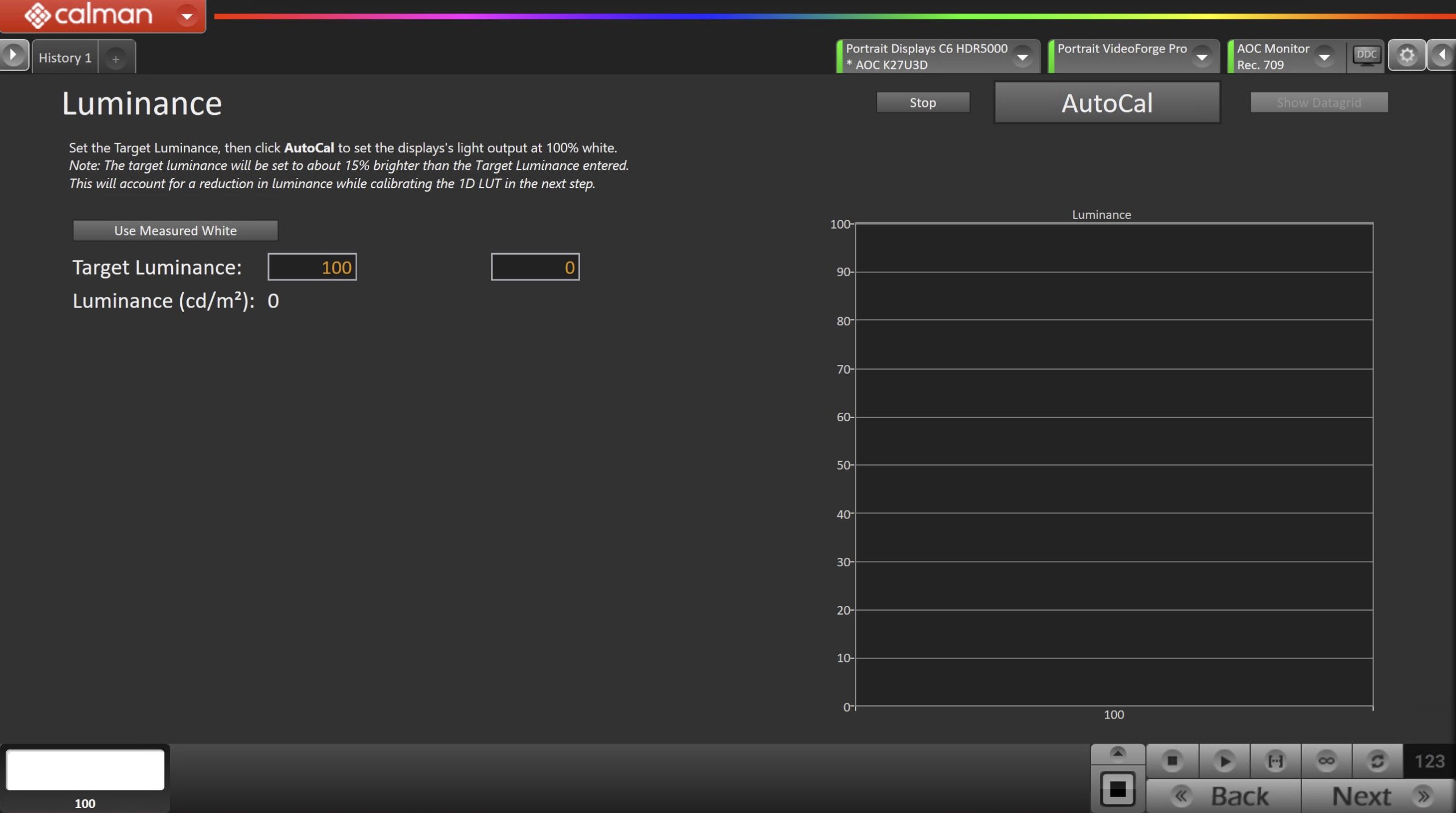 - Set the Target Luminance, then click AutoCal to set the displays’s light output at 100% white.
