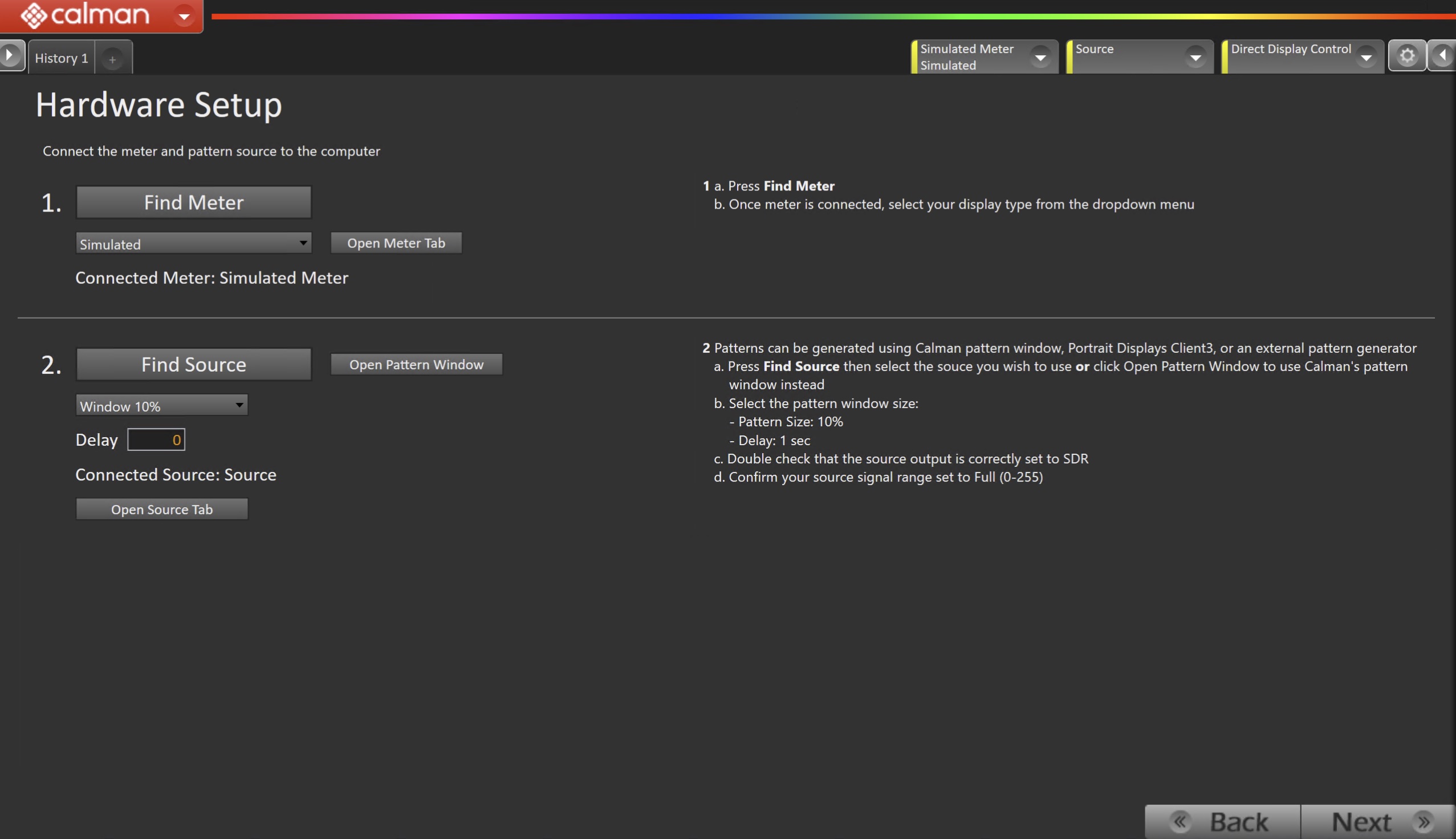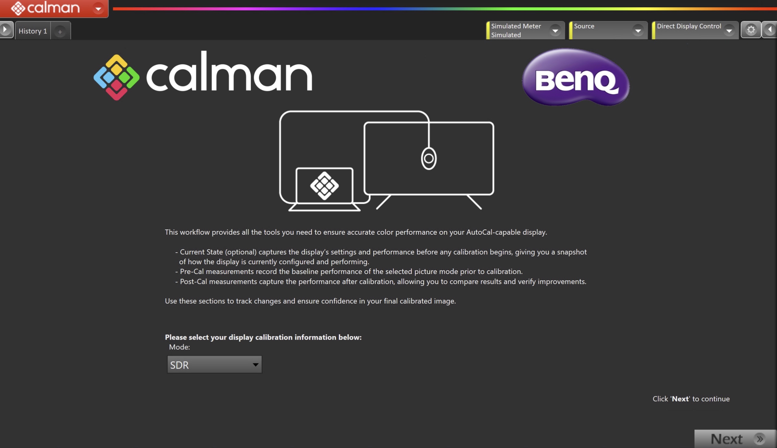 - On the introduction screen, select your calibration mode (SDR or HDR) from the dropdown and click Next to proceed to Hardware Setup