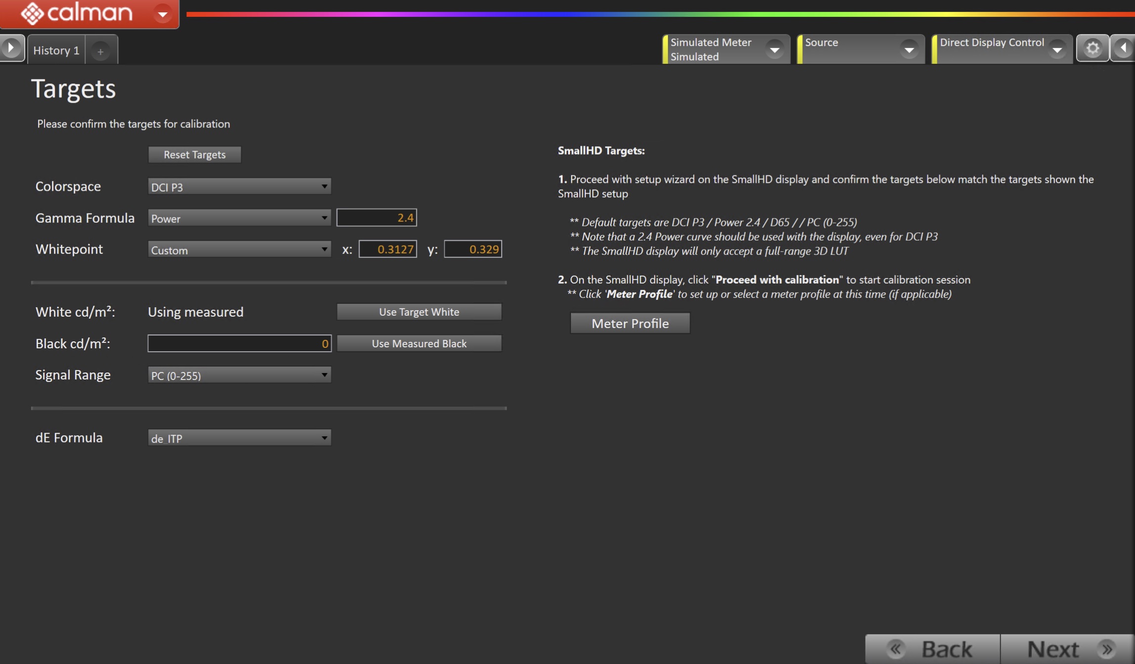 - Default targets are DCI P3 / Power 2.4 / D65 / PC (0-255)