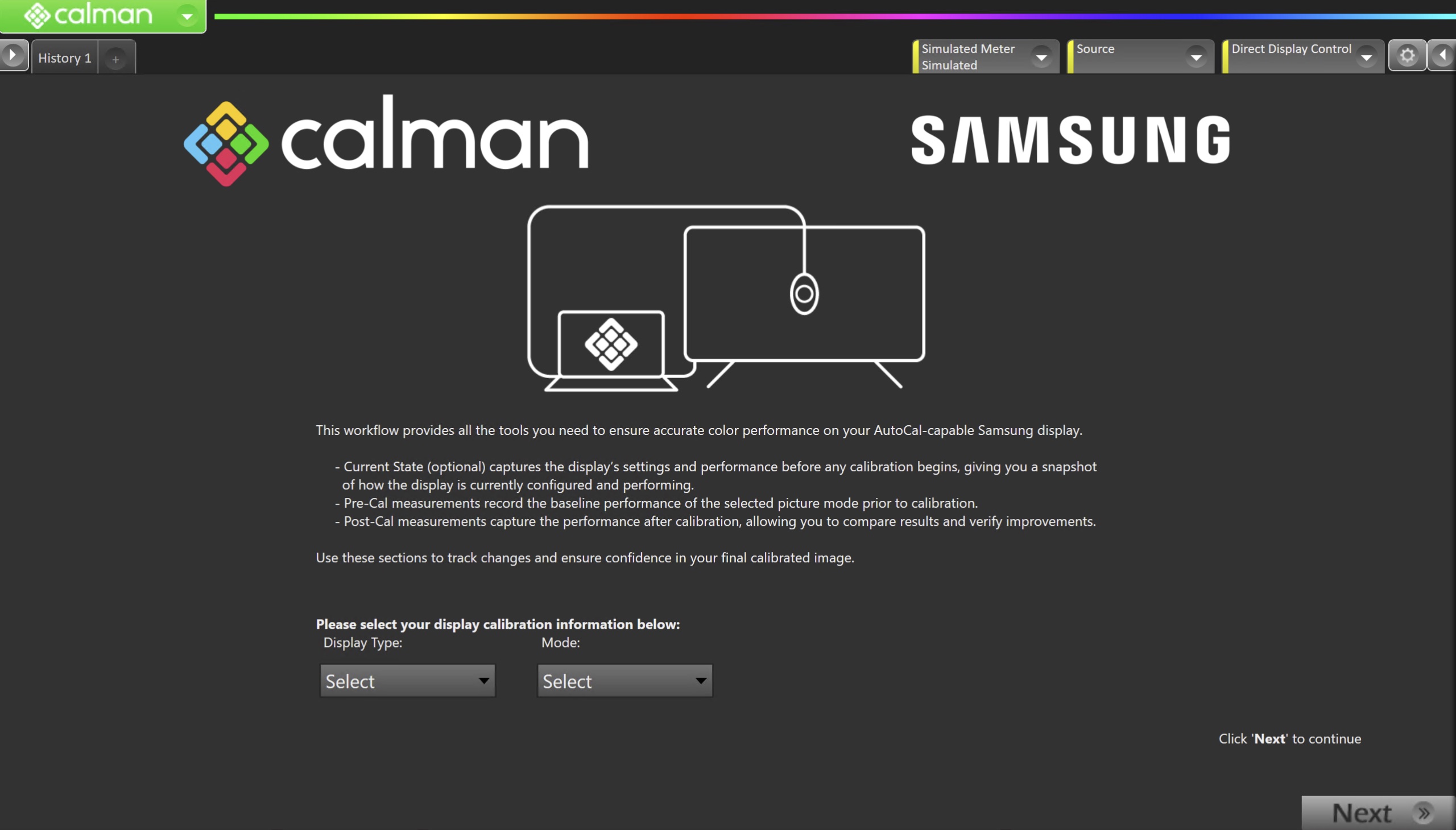 - On the introduction screen, select your display type (LCD/OLED) and calibration mode (SDR/HDR) from the dropdown and click Next to proceed to Hardware Setup