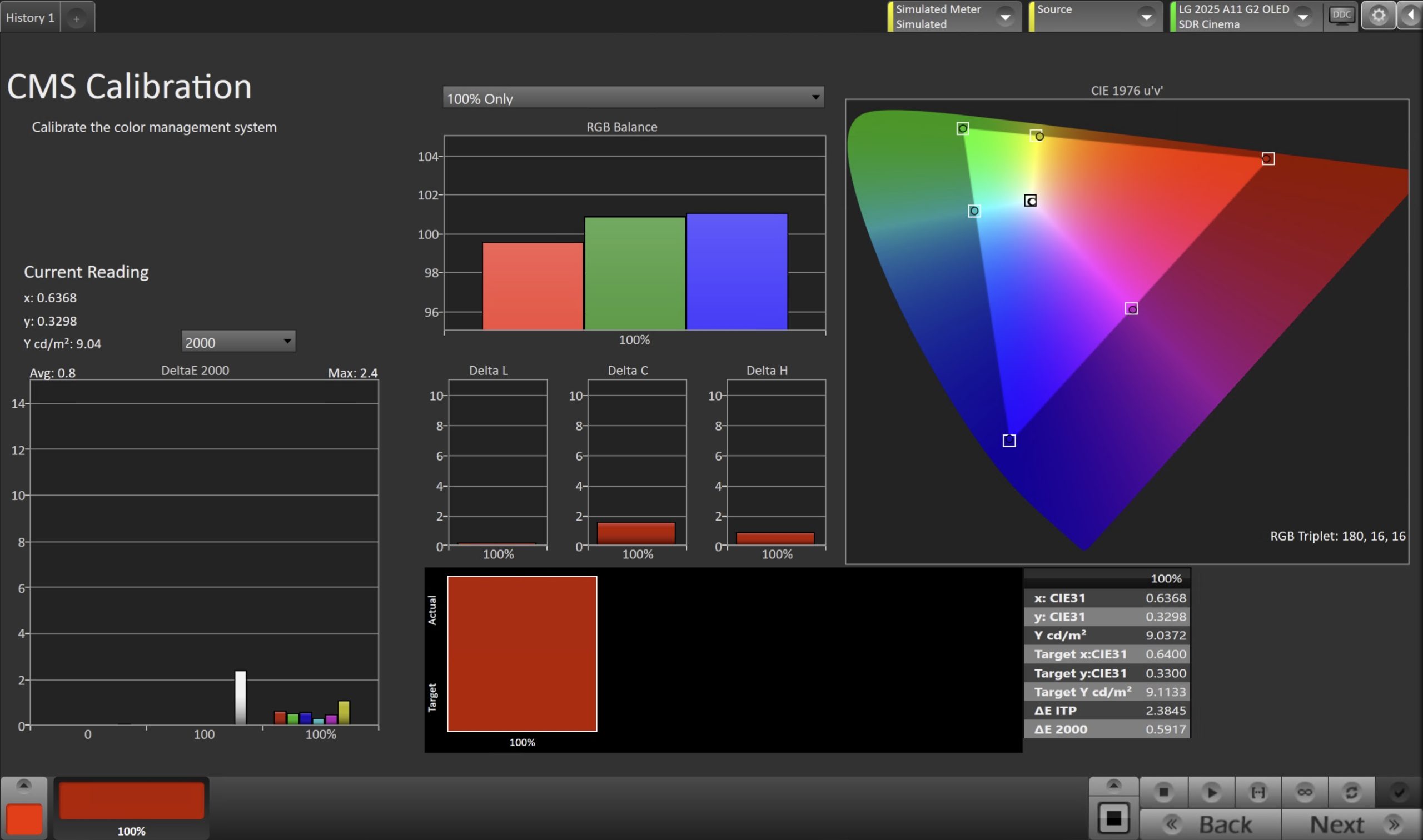 Color errors are typically expressed as deltaE (dE) values such as dE2000 or dEITP/BT.2124. The overall dE value indicates how far the measured color is from the target. However, it does not identify which component of the color needs to be corrected.