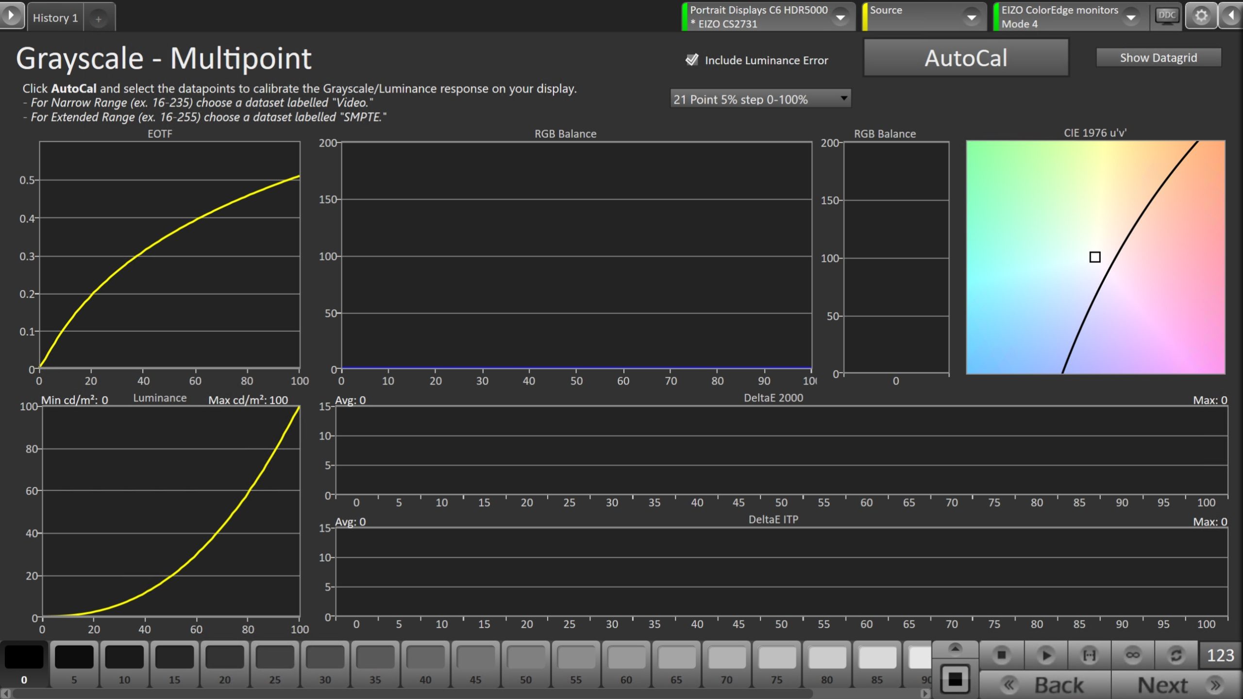 - Click the AutoCal button and select the correct data points in the AutoCal Dialog to auto-calibrate the Grayscale/Luminance response on the display.