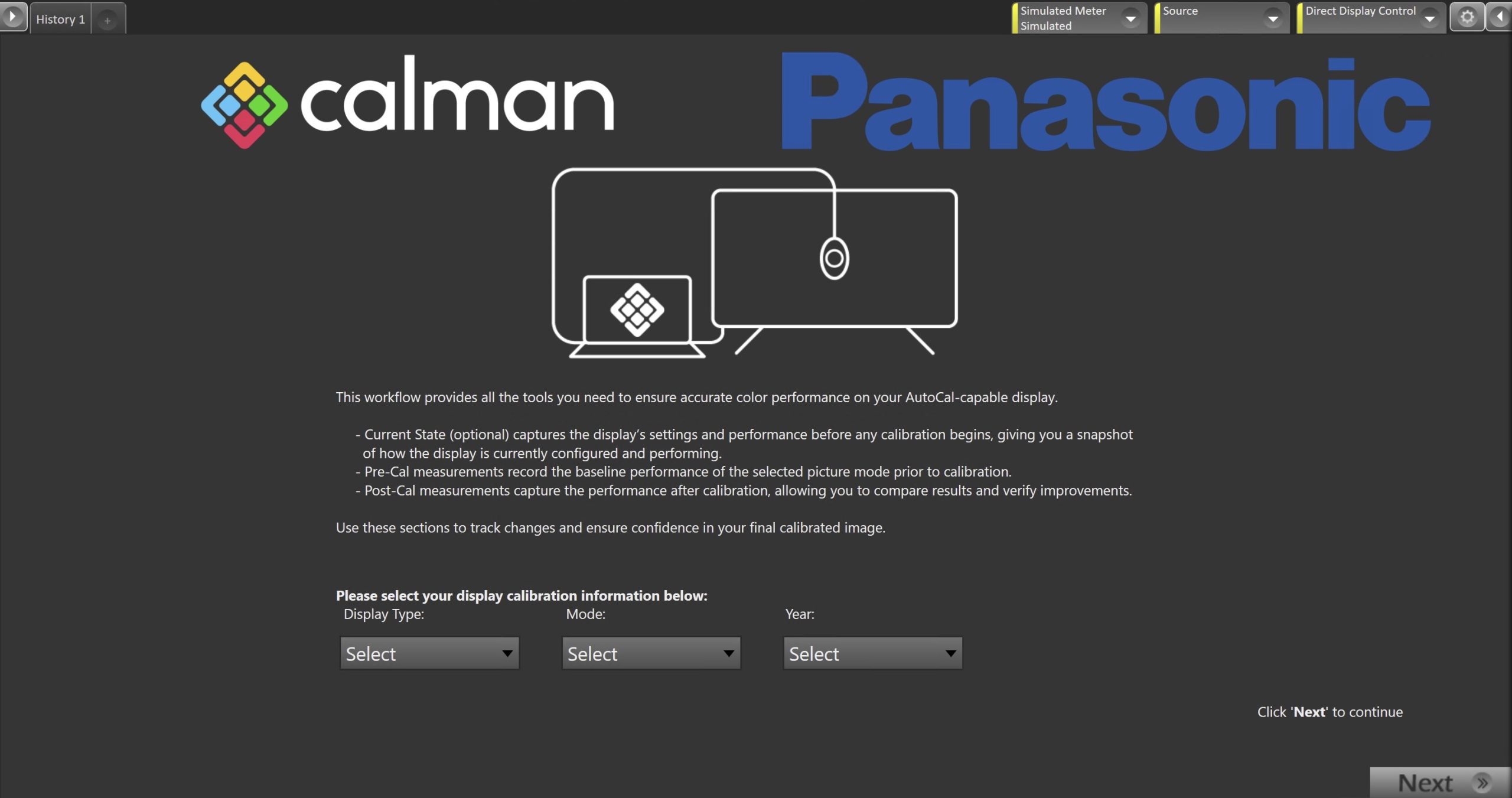 - On the introduction screen, select your display type (LCD/OLED), calibration mode (SDR/HDR/Dolby Vision), and Model year (2024+/2023-2013) from the dropdown and click Next to proceed to Hardware Setup