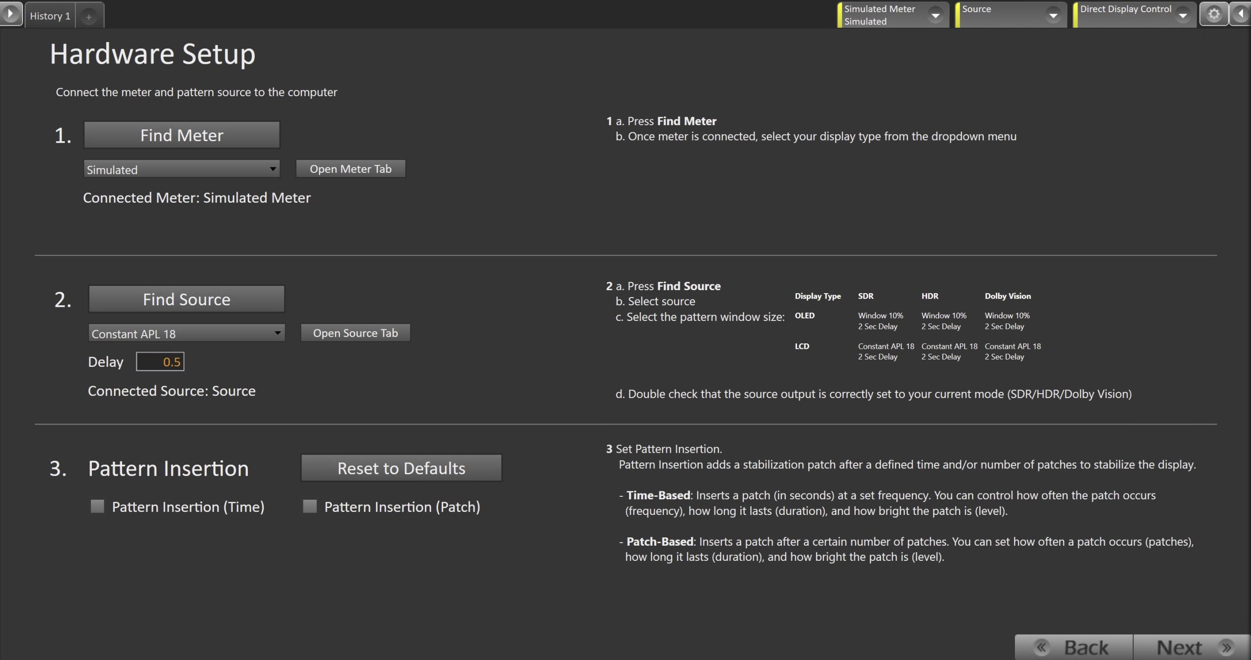 - Click the Reset to Defaults button to set the appropriate pattern insertion for the display and calibration type in Step 1