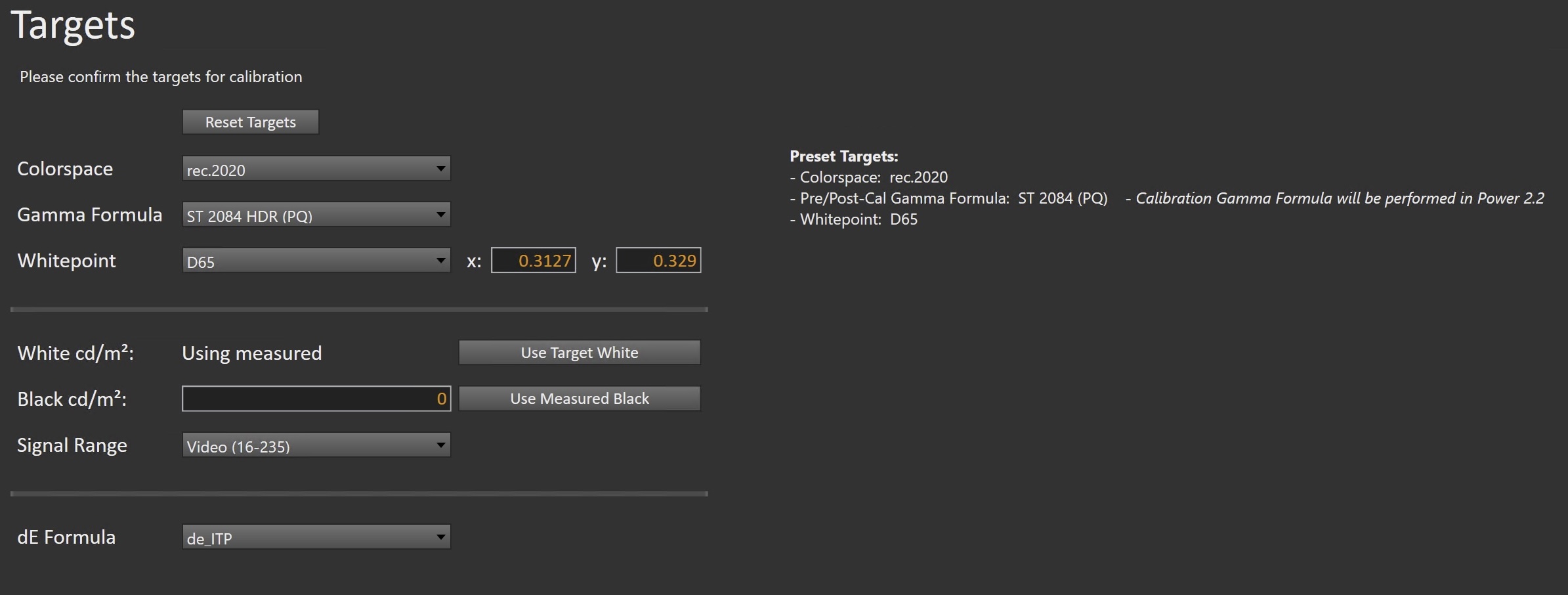 - Confirm/configure your calibration targets. These will be automatically set to common defaults by the options from Step 1