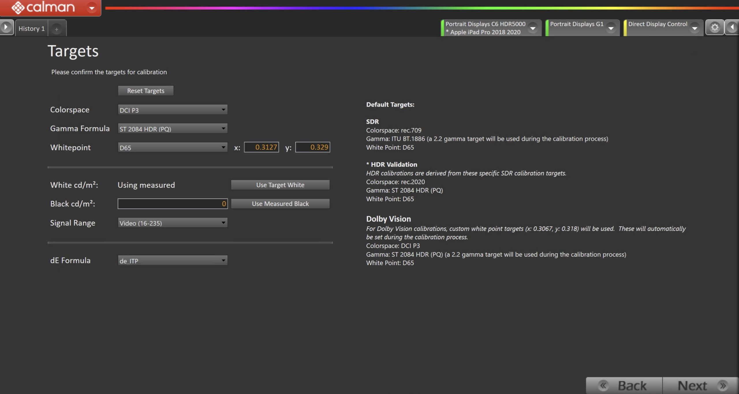 - Confirm/configure your calibration targets. These will be automatically set to common defaults by the options from Step 1