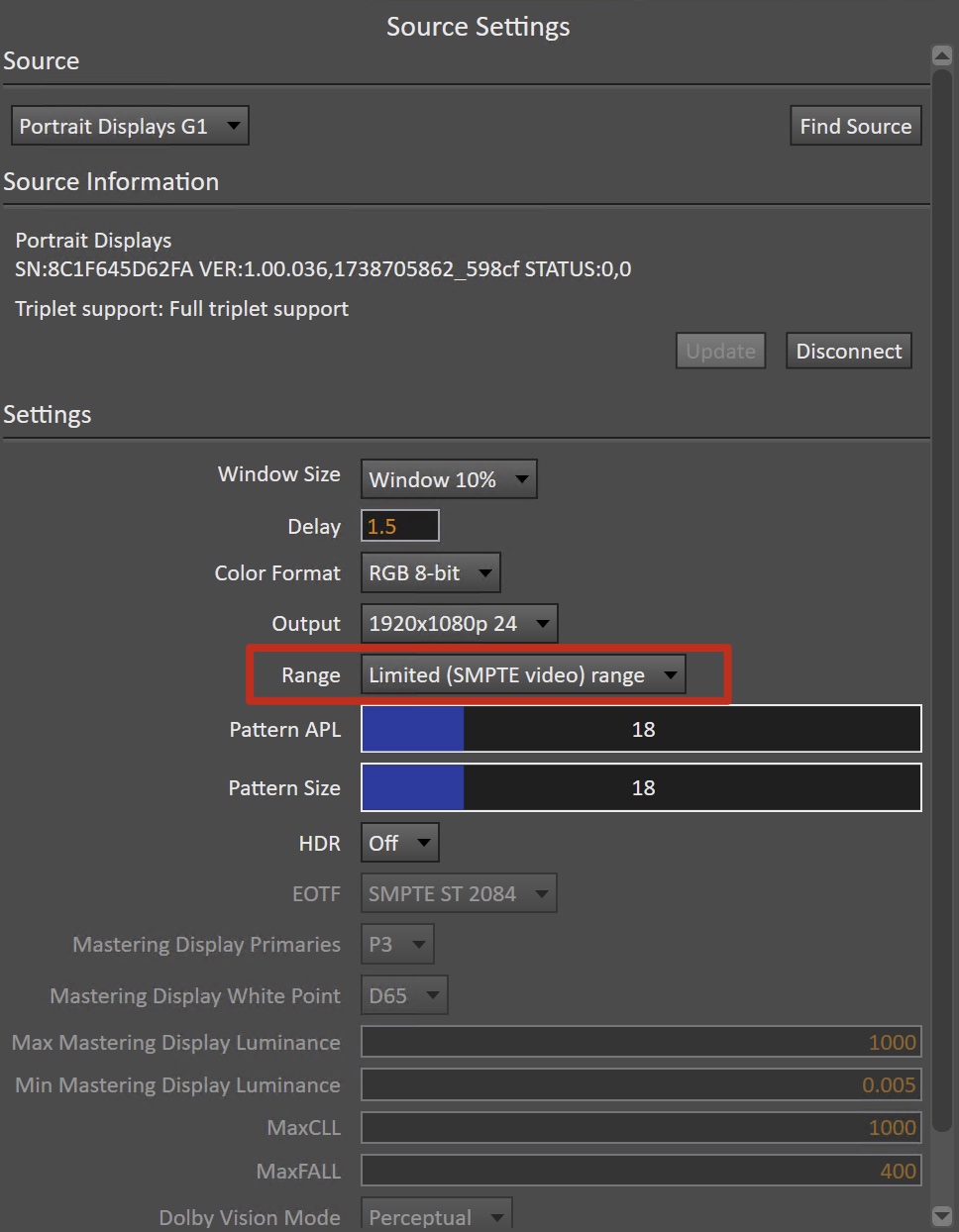 - The test pattern generator in Calman must be set to output the same range as your display/source device.